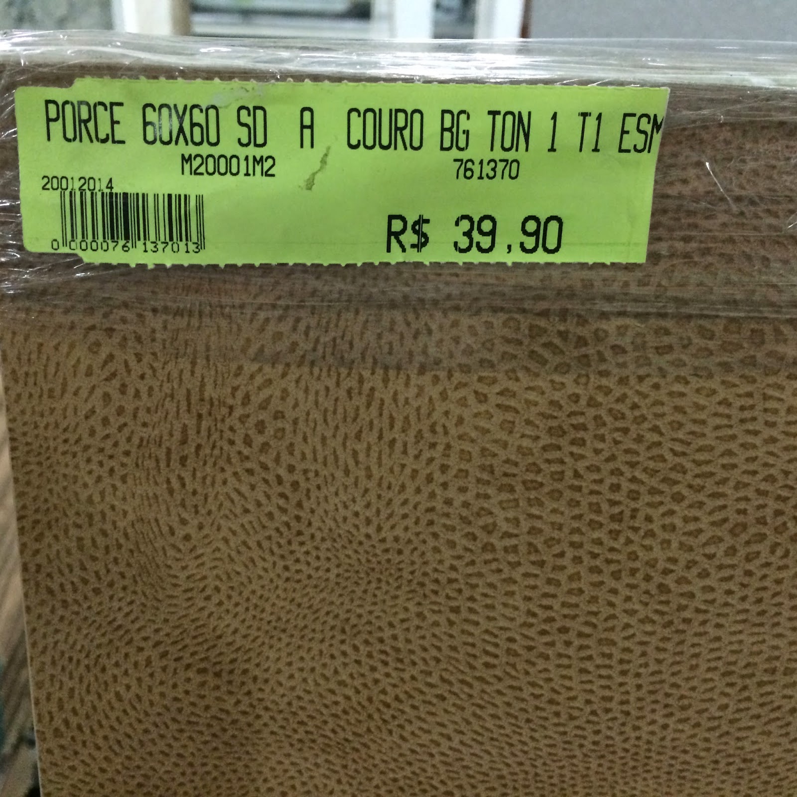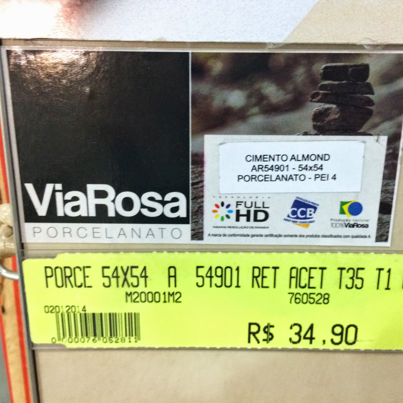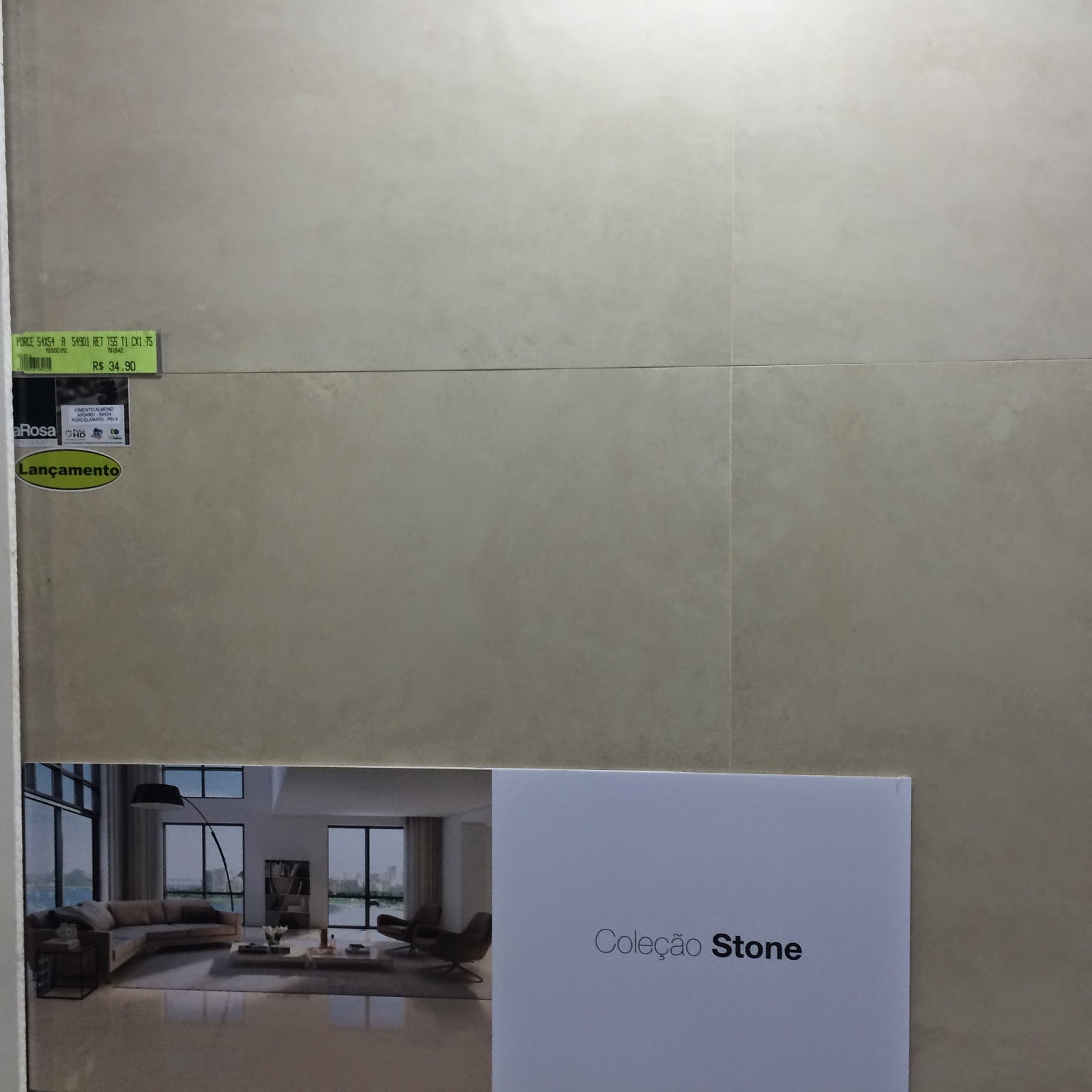 Porcelanato Retificado da Via Rosa, coleção Stone / Aquitect – lindo de viver, acetinado, perfeito. R$34, 90 o metro quadrado, disponível imediatamente (inclusive pode levar na hora), mas depois de uma pesquisa rápida na net, achei na Leroy Merlin por R$31,90 por encomenda. Achei R$32,90 um preço justo por um porcelanato desta qualidade