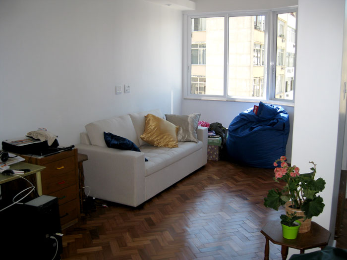 Já cheguei a falar sobre esse detalhe em outro post. Então serei breve aqui. No meu projeto inicial, tinha escolhido uma outra posição pro sofá. Na foto abaixo temos a nova posição, que acabei preferindo depois que o sofá chegou e preencheu a sala. Problema nenhum mudar o sofá de lugar, certo? Certo, se eu não tivesse duas tomadas na parede logo acima dele. Feio, né? Fazer o que? No projeto original, ali deveria entrar a televisão.