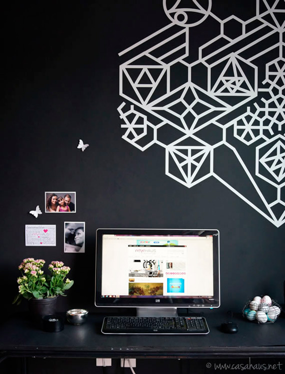 Este é a festa da fita isolante branca na parede preta. (Veja outras ideias com fita isolante aqui 🙂