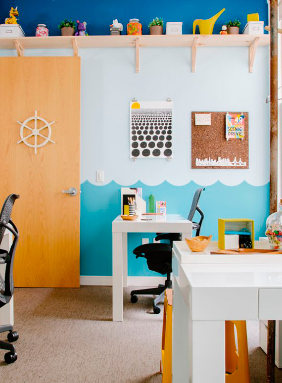 Este é de um escritório de design. Esta pintura com mistura de azuis não é difícil de reproduzir e faz toda a diferença.