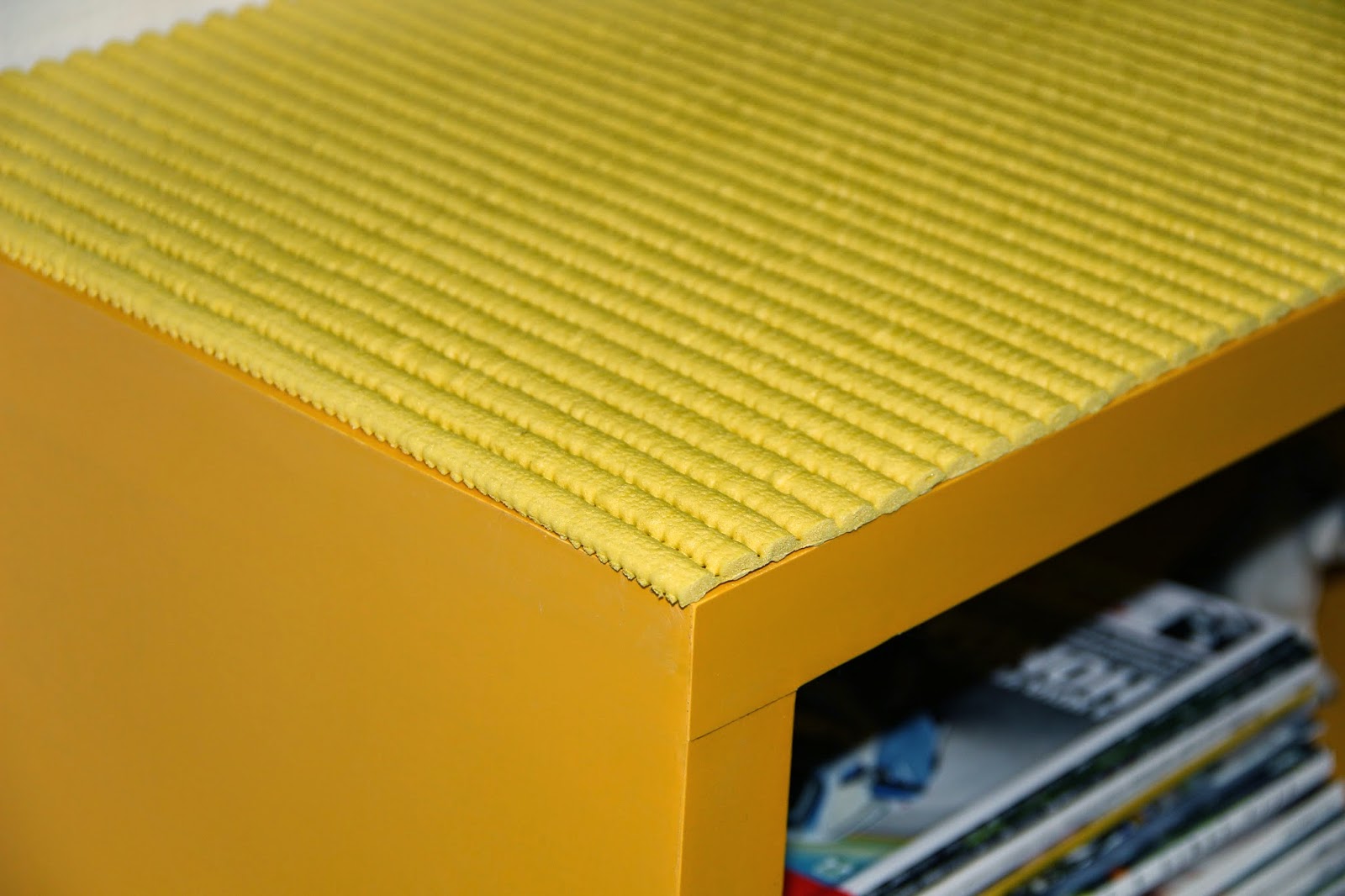 Como o Cristóvão escorregou a primeira vez que subiu, a solução foi colocar um tapetinho antiderrapante, cuja descrição técnica mais completa eu achei nesse site aqui. Veja no detalhe: