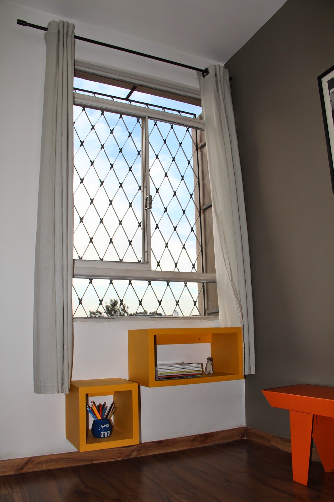 Ficou bem bacana né? Além de ser apoio para o Cristóvão bisbilhotar na janela, tornou-se um novo lugar para guardar as revistas que a gente cisma guardar e que nunca mais voltaremos a folhear… A intenção é que ele use o nicho menor para subir até o maior… Ele ainda está se familiarizando com a “escada”, mas isso é questão de tempo: